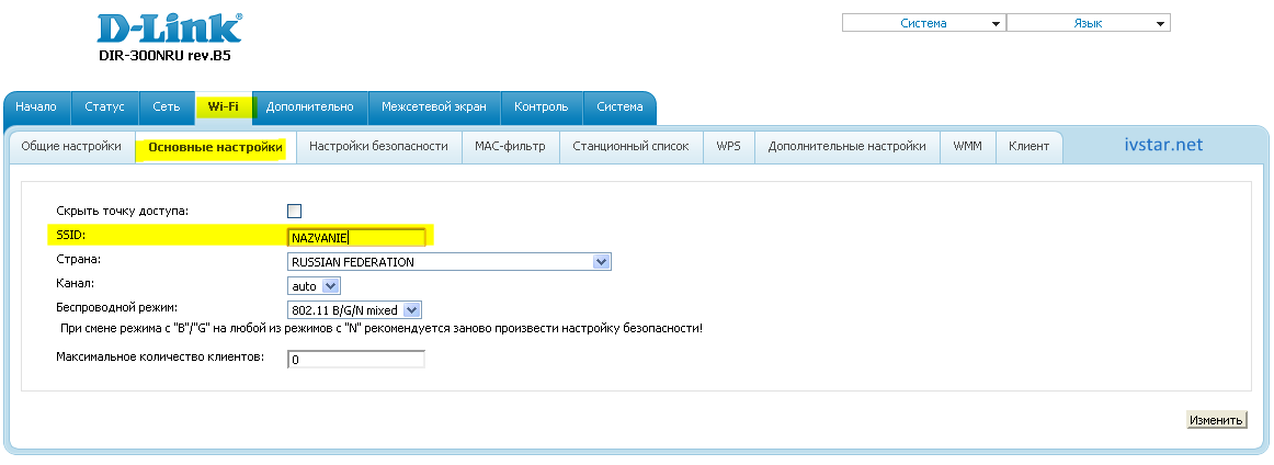 В разделе Основные настройки задаем латинскими буквами и цифрами название вашей беспроводной сети в поле SSID. Жмем кнопку Изменить.