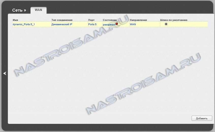 Попадаем в раздел настройки внешнего соединения WAN. Нажимаем кнопку Добавить для создания подключения к Интернет: