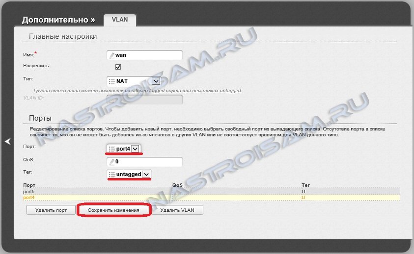 Внизу, в поле Порт выбираем любой порт. Вообще, обычно под приставку занимается 4-й порт. Его мы и выберем. Нажимаем кнопку Удалить порт, а затем Сохранить изменения. Попадаем назад в список VLAN.