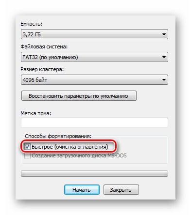 Убедитесь, что пункт «Быстрое (очистка оглавления)» отмечен галкой. Так вы сэкономите время на очистку. Но если хотите, чтобы во время форматирования система проверила флешку на ошибки, то снимите галку — тогда процесс продлится намного дольше. Нажмите «Начать» и дождитесь завершения процедуры.