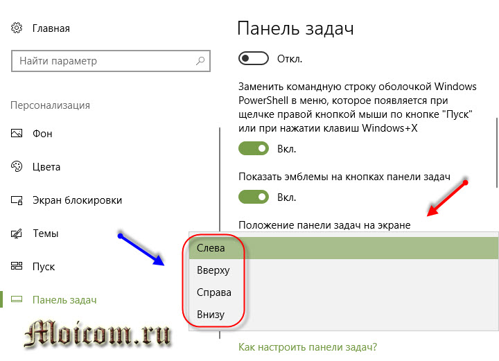 Щелкнуть правой кнопкой мыши по свободному от значков пространству Панели задач и выбрать в выпадающем меню пункт «Параметры Панели задач». Затем найти на странице настроек «Положение панели задач на экране»