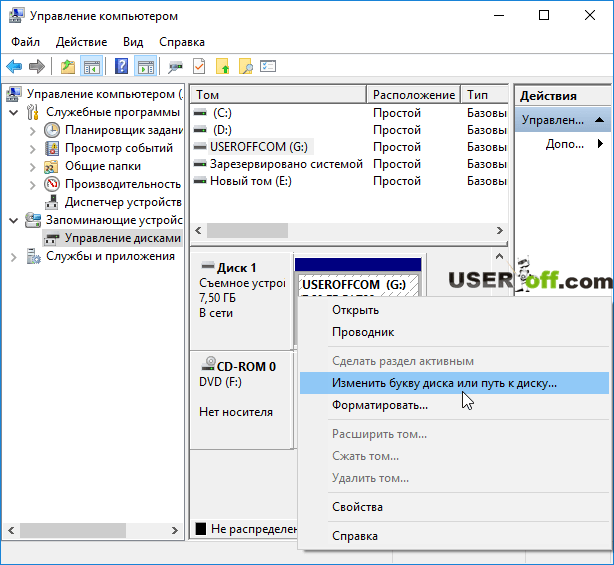 Откроется окно, в котором справа нажимаем на “Управление дисками”, ждем немного пока система загрузит информацию, и ищем в списке наш раздел, который называется «Зарезервировано системой». Нажимаем на него правой кнопкой, и выбираем “Изменить букву диска или путь к диску… “.