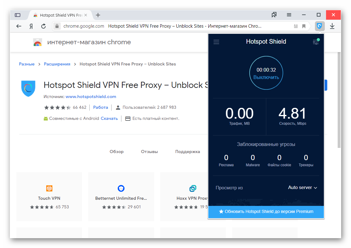 Еще один известный инструмент для обхода блокировок, созданный компанией Anchor Free. Помимо собственно расширения для Chrome, существуют версии продукта для iOS, Android, Windows Phone, OS X и Windows. Как и в случае ZenMate сервисом можно пользоваться как бесплатно, так и купить расширенную версию (цена стартует с $5,99).